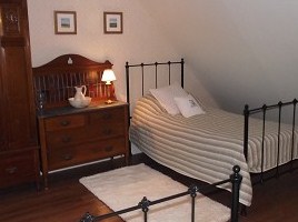De cottage ziet er romantisch uit, de slaapkamer bevindt zich op de eerste etage onder de hanenbalken. Geen hor. En er staat een smal ledikant. Een ledikant!