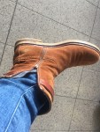 Aan de andere kant van het poortje moet de laars weer aan, ik kan moeilijk op mijn sok door de vertrekhal lopen. Paul bestudeert de rits. Of ik iets in mijn tas heb dat precies door het gaatje van het trekkertje past. Na lang rommelen in mijn tas vind ik een tandestoker. Hij past door het gaatje en …. breekt af.