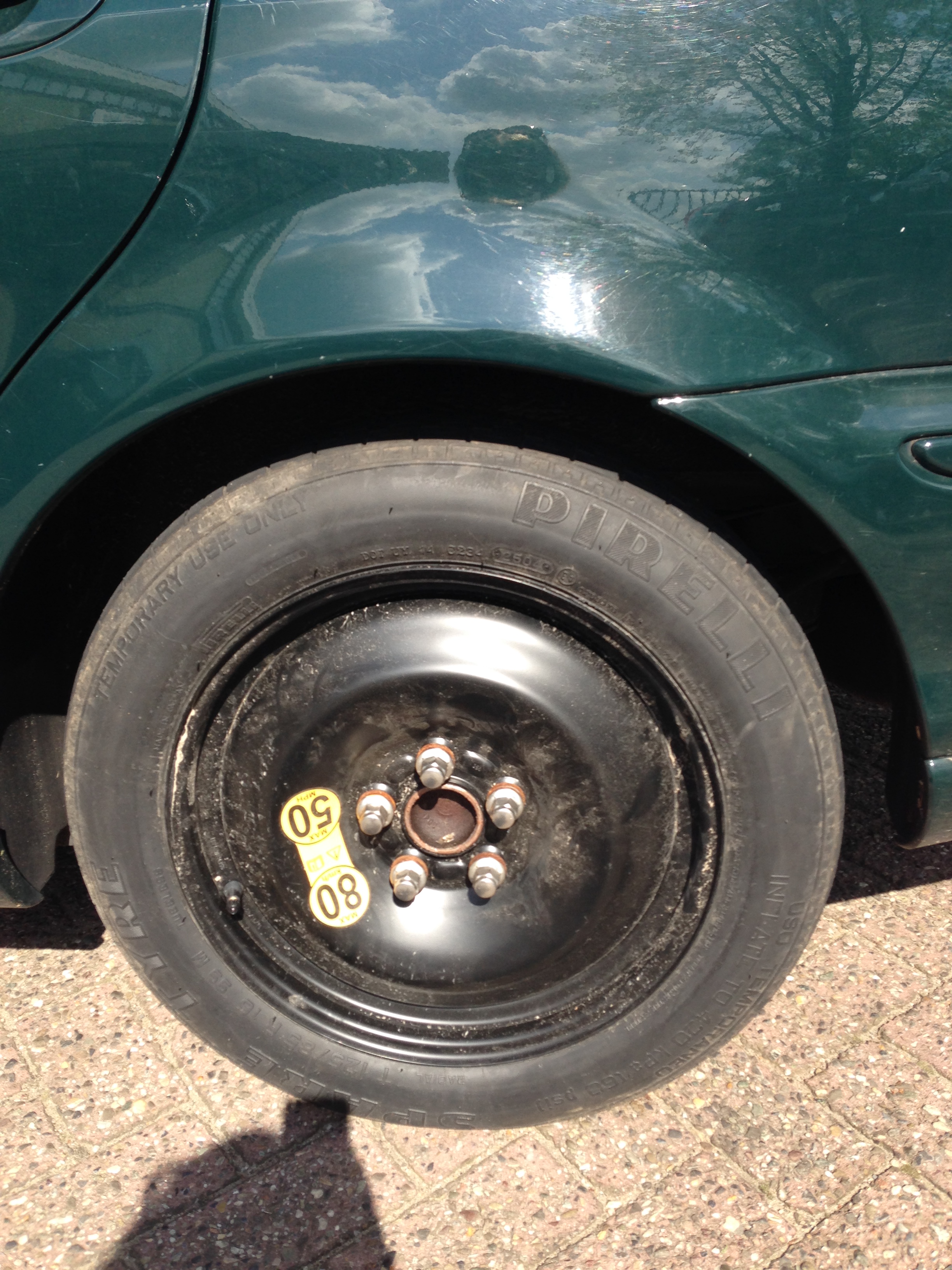 Oh, dat ziet hij aan de buitenkant. Ik vertrouw de man niet en vertrek weer met de lekke band onder mijn arm. Nou ja, in de kofferbak.