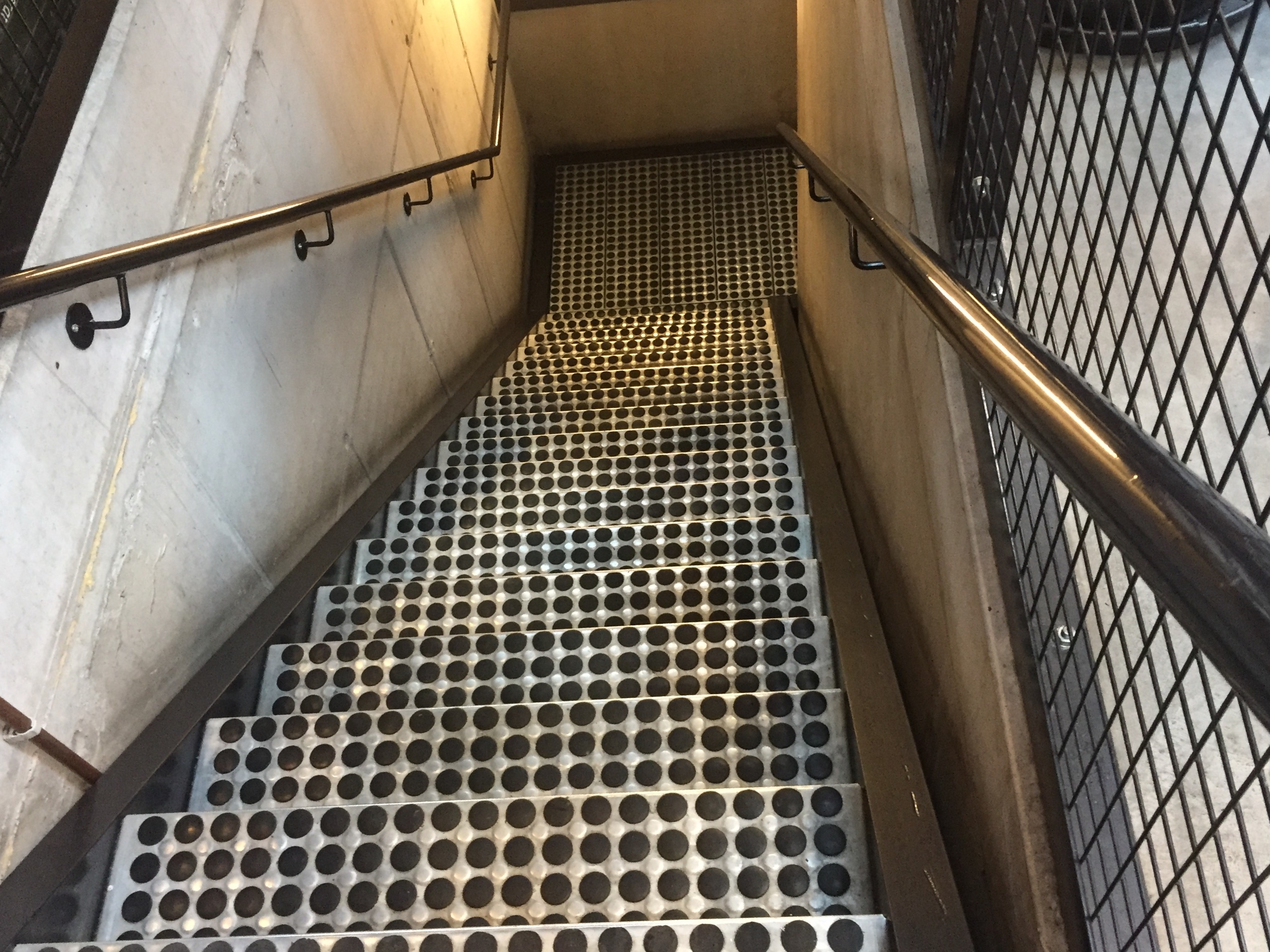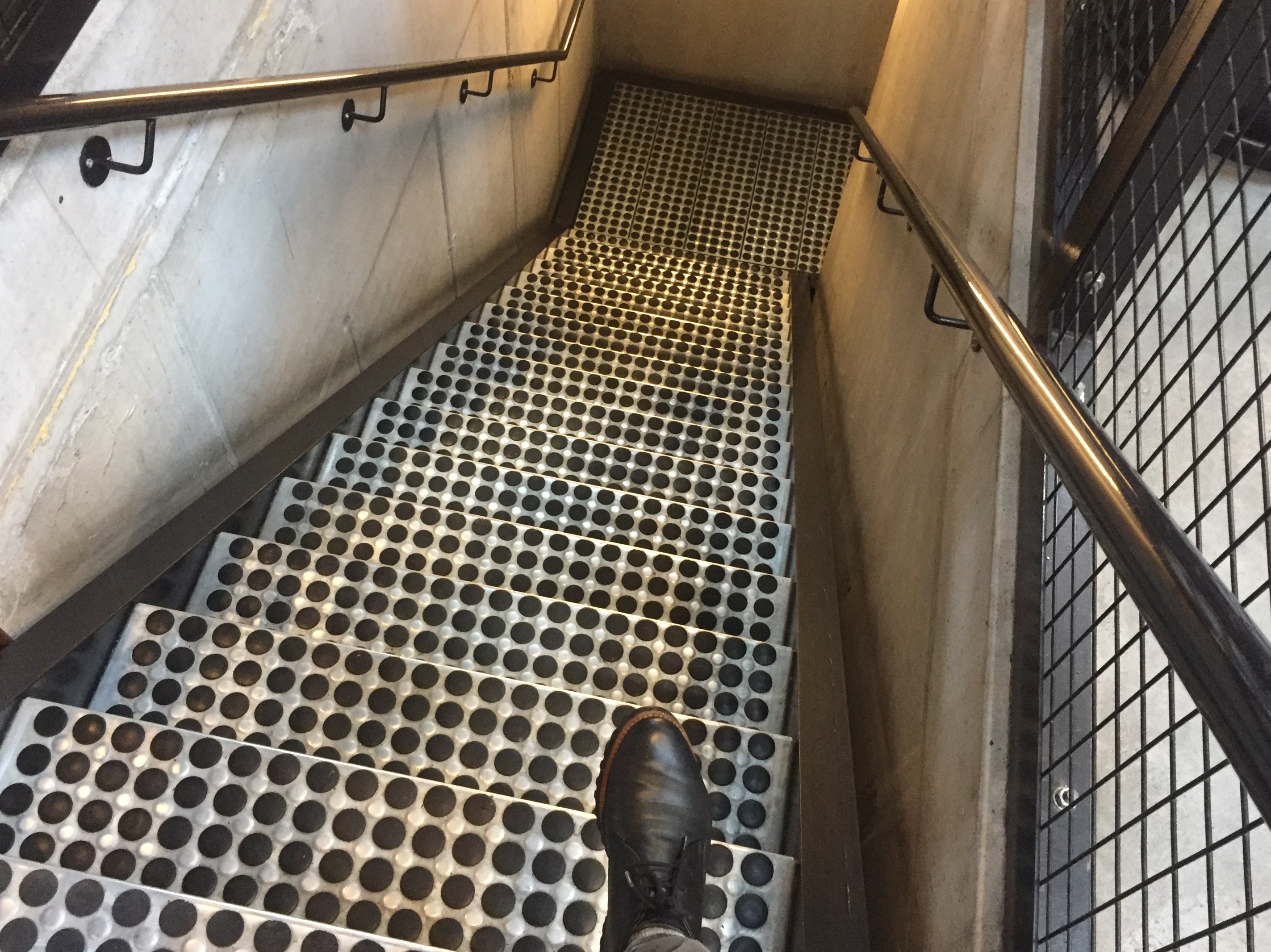 De combinatie van slechte verlichting, mijn neiging van trappen te lazeren en mijn bijziendheid maakt dat ik de leuning stevig vastgrijp en na twee treden even stop. Ik kijk in de diepte om me te oriënteren hoe de trap loopt, want dat is niet zo duidelijk te zien door het wilde patroon.